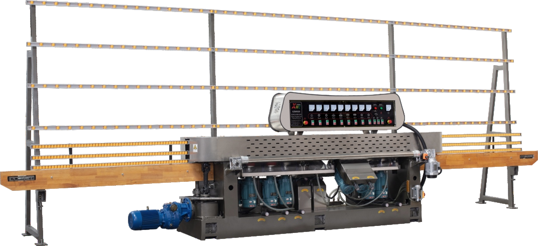 产品特点采用无链条轴承滚动链板结构,磨头可升降;控制系统采用PLC控制,可自动、手动转换;人机界面清楚显示玻璃厚度、斜边宽度、角度、剩余厚度和速度等参数;各种参数可以通过人机界面进行输入:传送速度采用变频调速;可在本机进行修磨链板,标配后链板自动清洗装置。